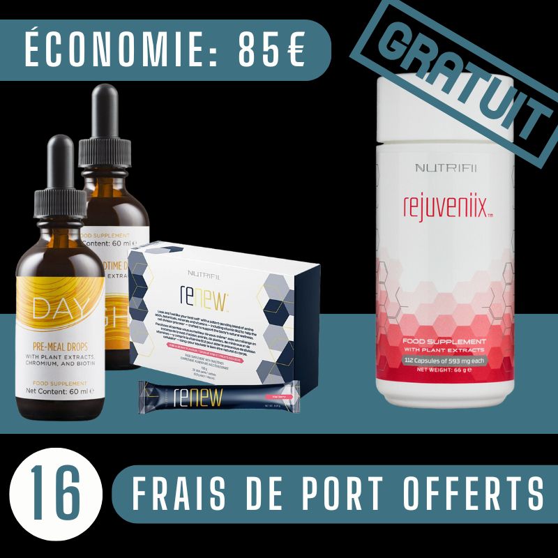 Pour l’achat d’un RENEW et des GOUTTES DAY & NIGHT, recevez en cadeau le REJUVENIIX et les frais de port sont également OFFERTS!